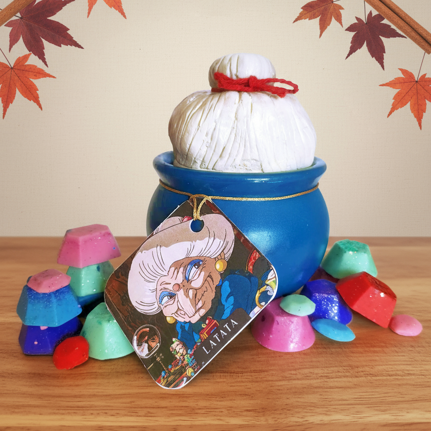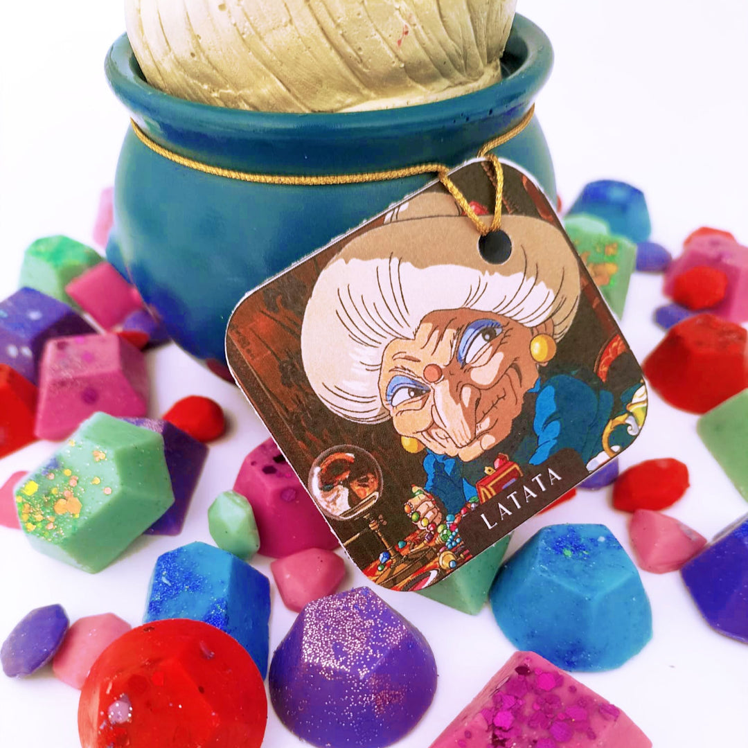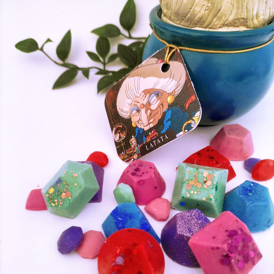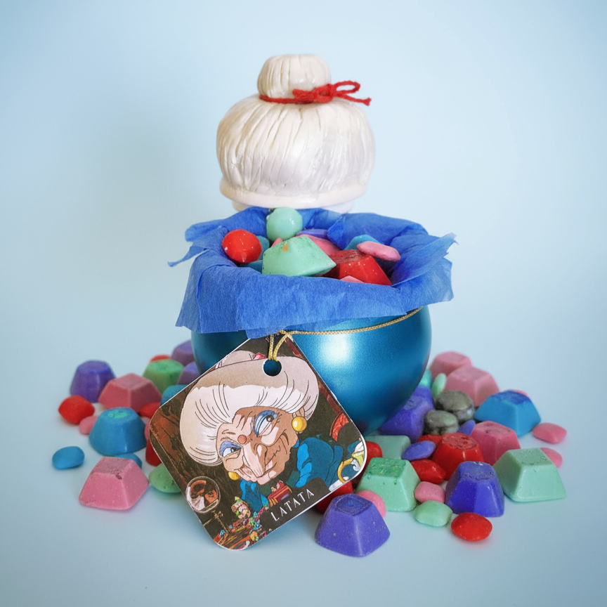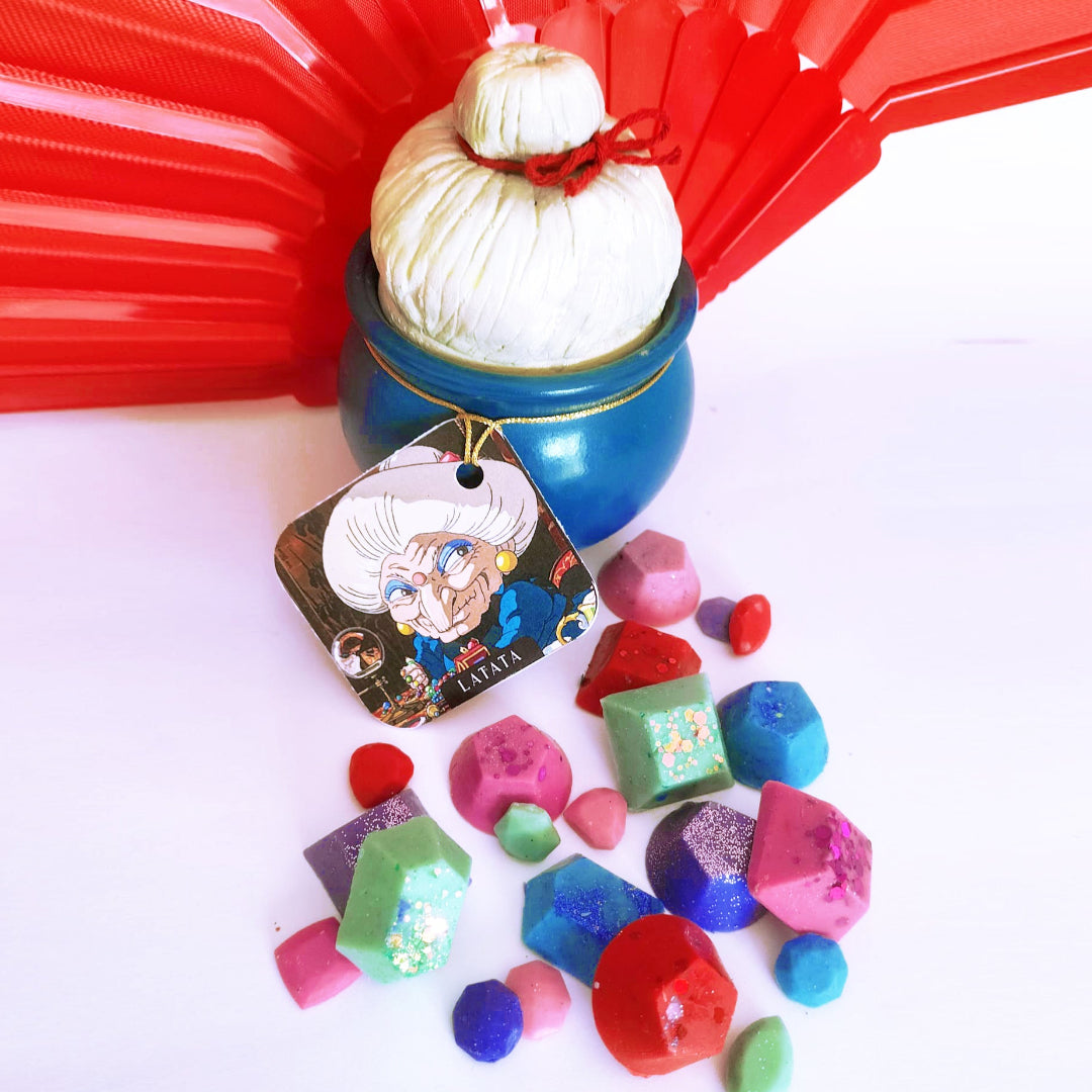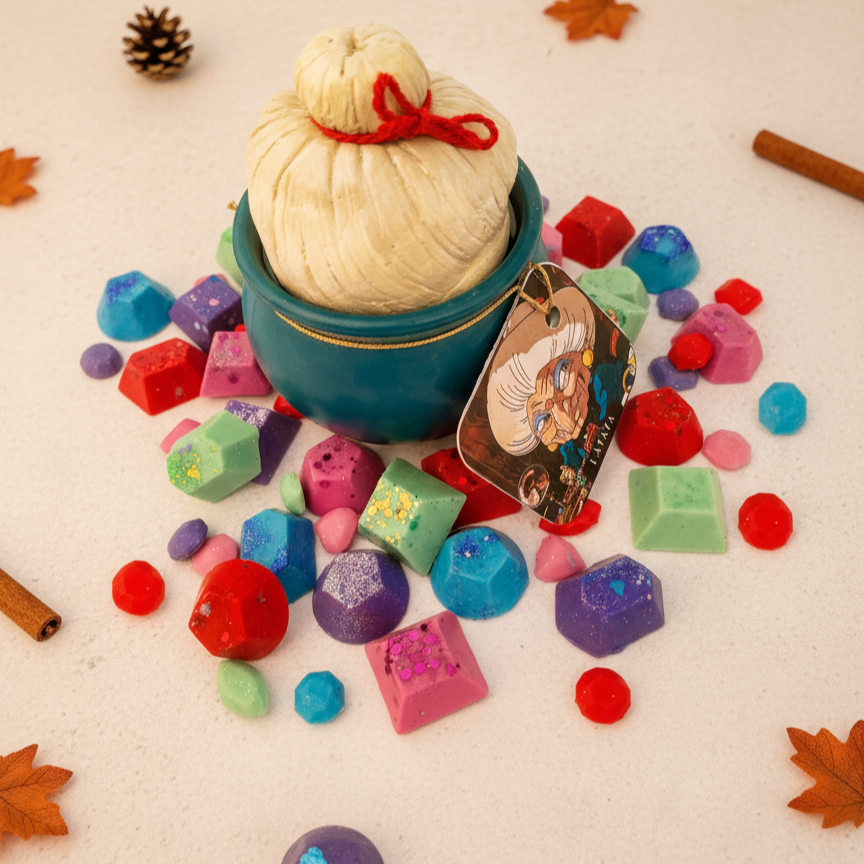 En su interior encontrarás 40 g de ceras perfumadas (aprox.) con aroma otoñal, místico y poderoso, en formas de rubíes y diamantes, evocando las deslumbrantes joyas que llenan sus aposentos. Cada parte ha sido seleccionada para transmitir la sensación de abundancia y magia que recuerda tanto a Yubaba.