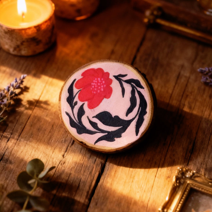 - Pintados a mano sobre una rodaja de madera natural.