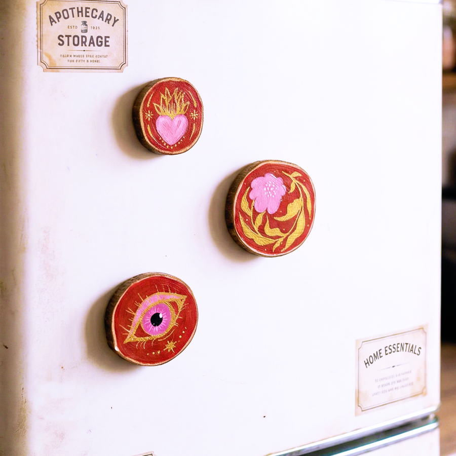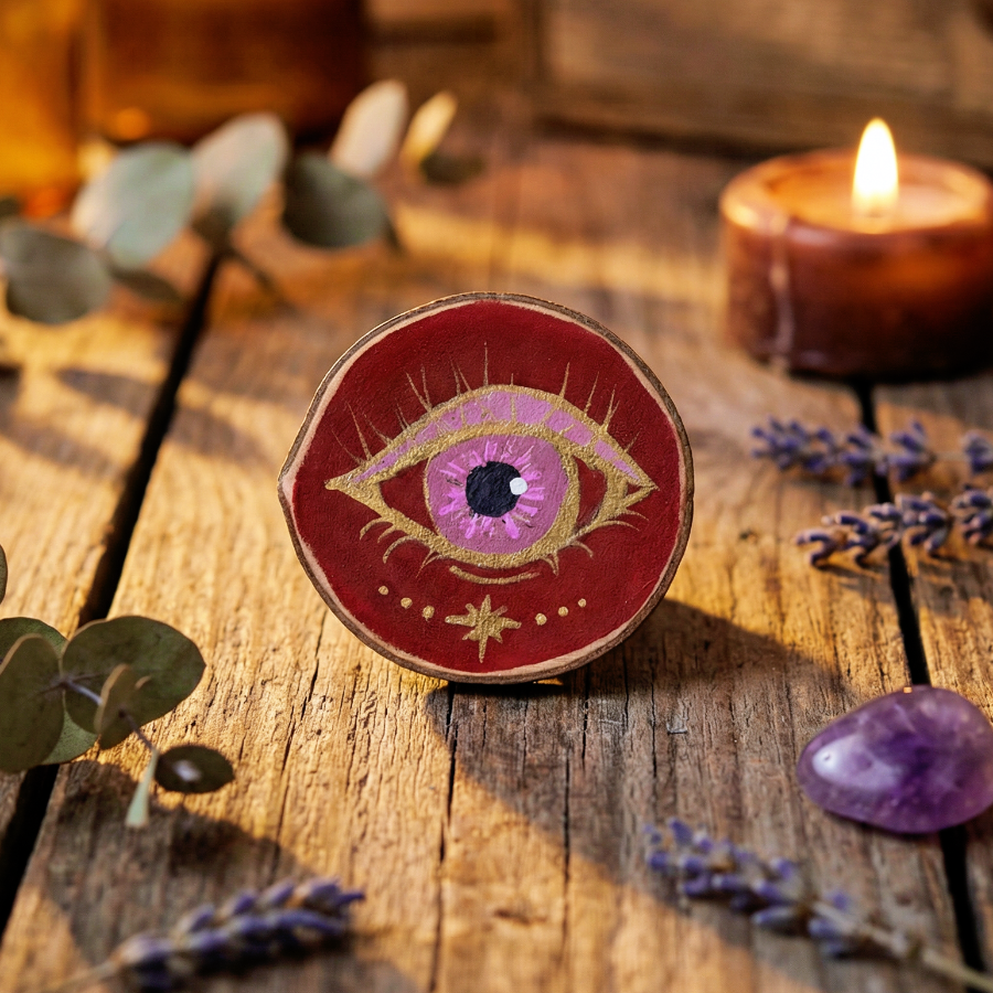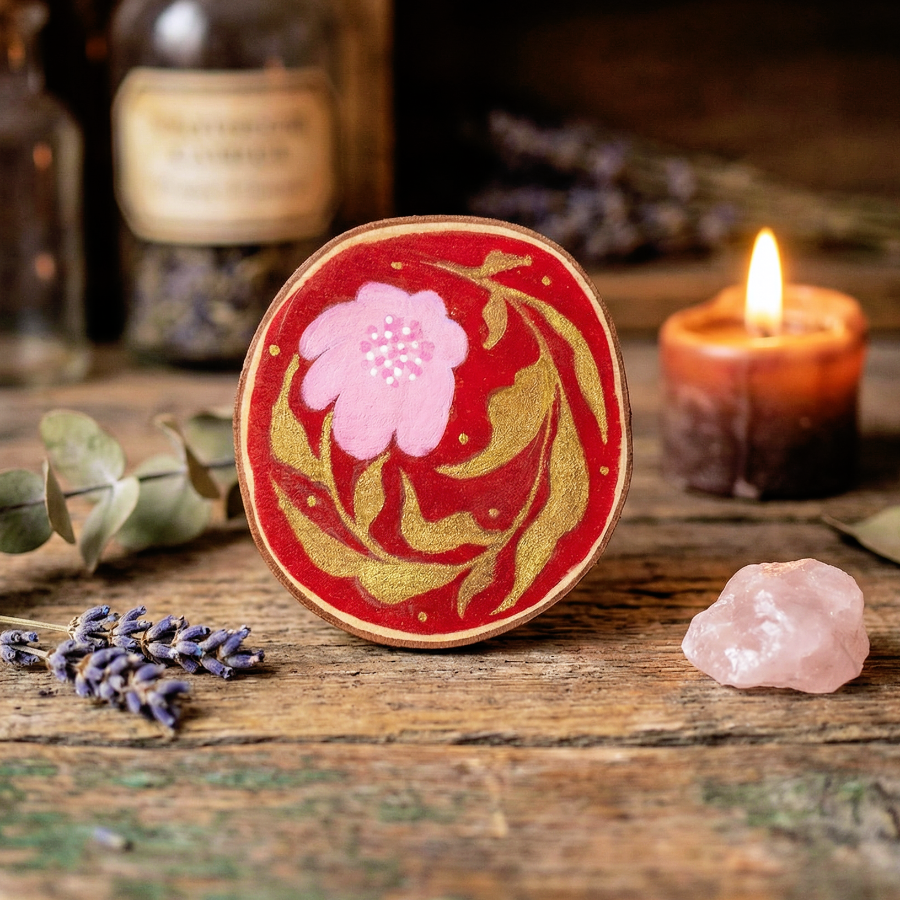 - Pintados a mano sobre una rodaja de madera natural.