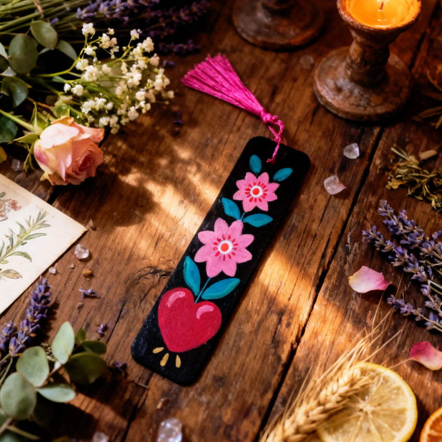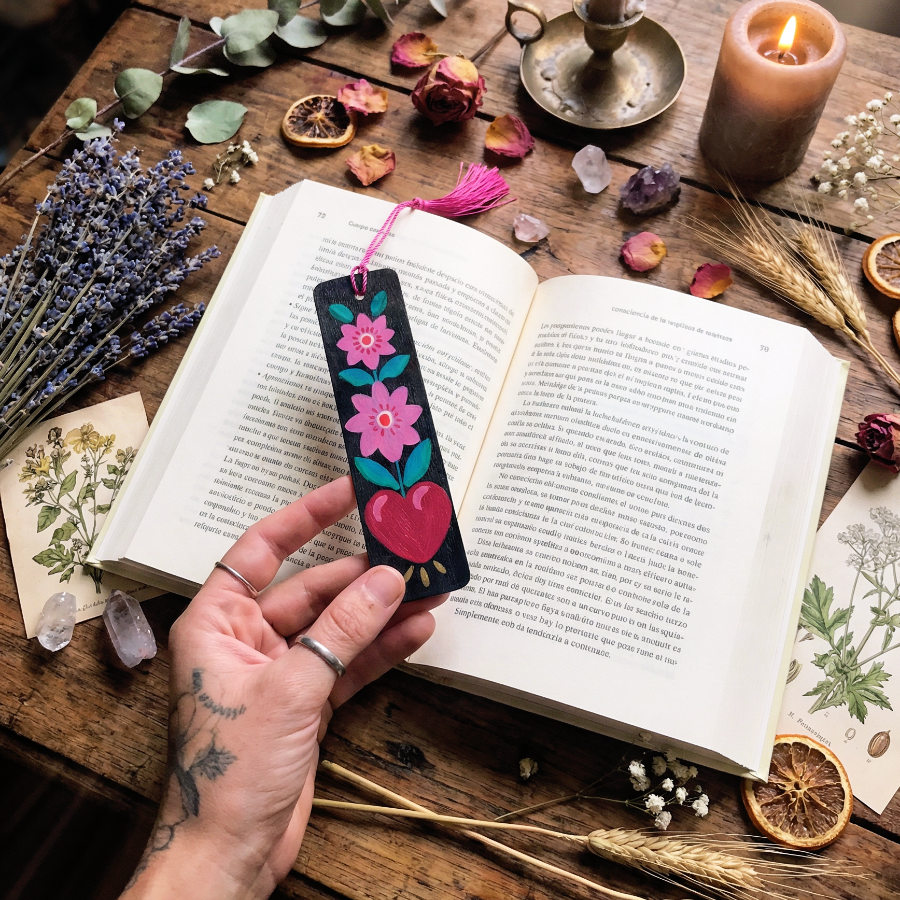 - Los marcapáginas son pequeños, finos, de madera y pintados a mano con una borla de hilo.
