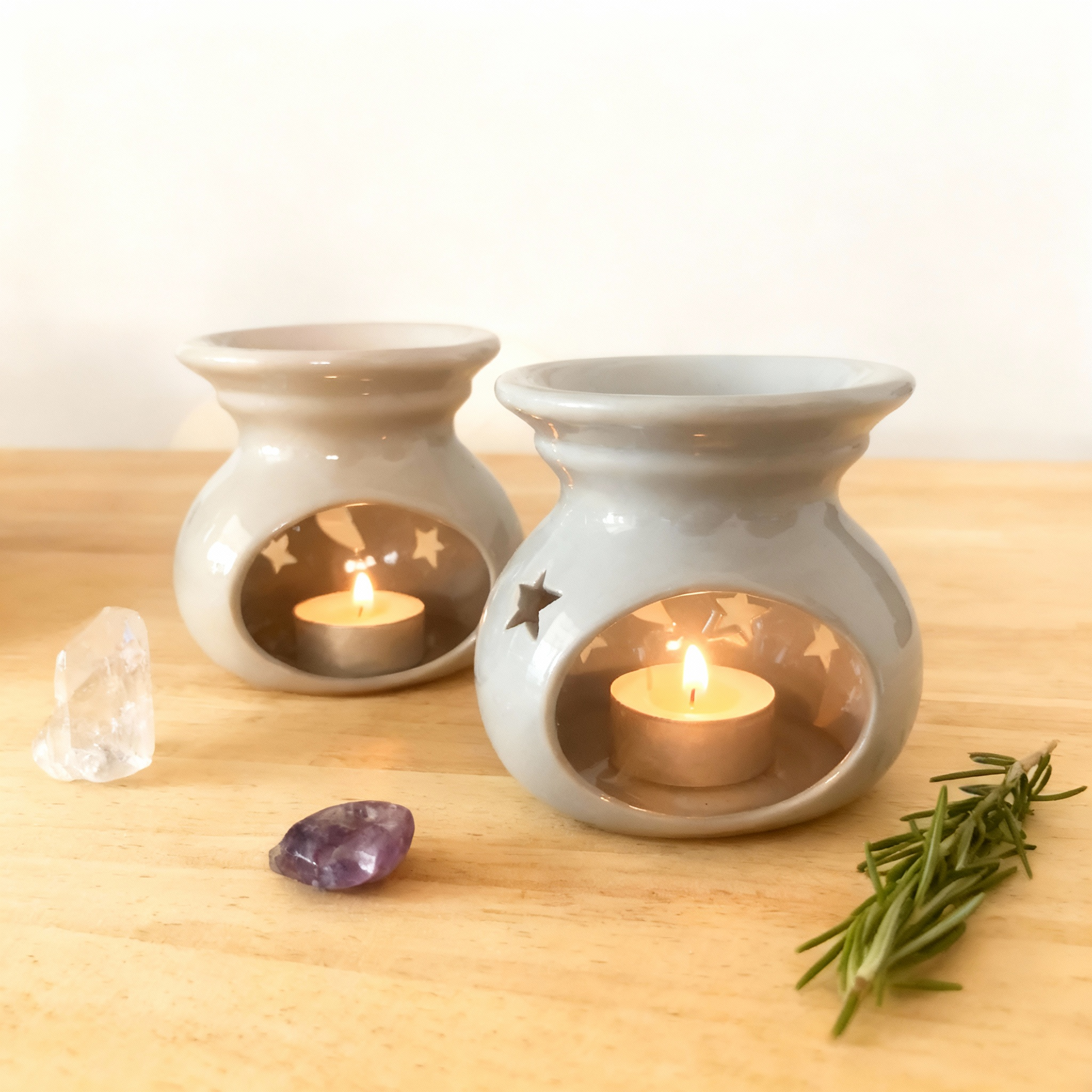 Este quemador, adornado con lunas y estrellas, transforma cualquier espacio en un rincón de calma y ensueño. Perfecto para derretir tus ceras perfumadas y dejar que la magia aromática se eleve suavemente en el aire 🌙 y llenar el ambiente de una luz suave y acogedora.
