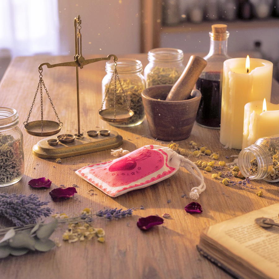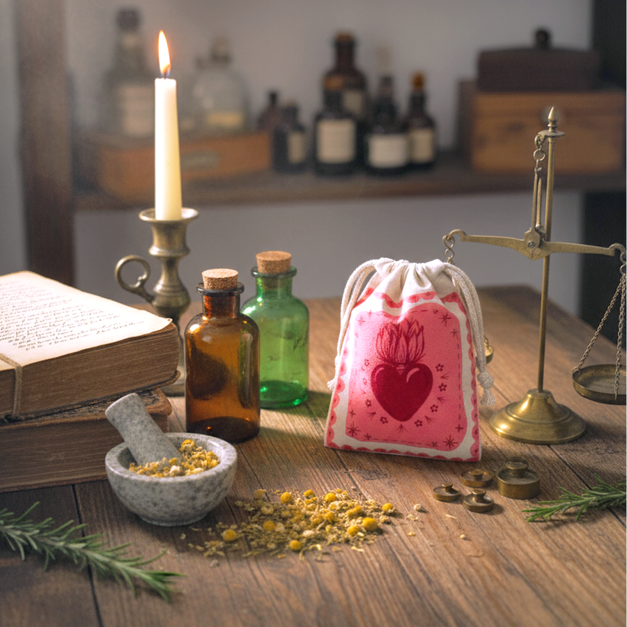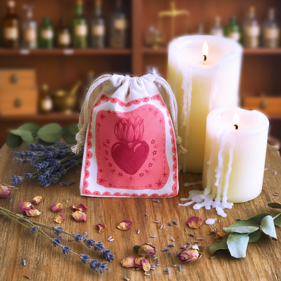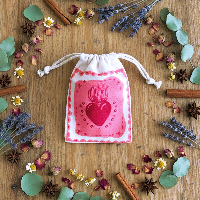 Saquito artesanal que guarda la pasión y la intuición. Simboliza el fuego interior que guía y enciende la energía del amor propio y la fuerza emocional.