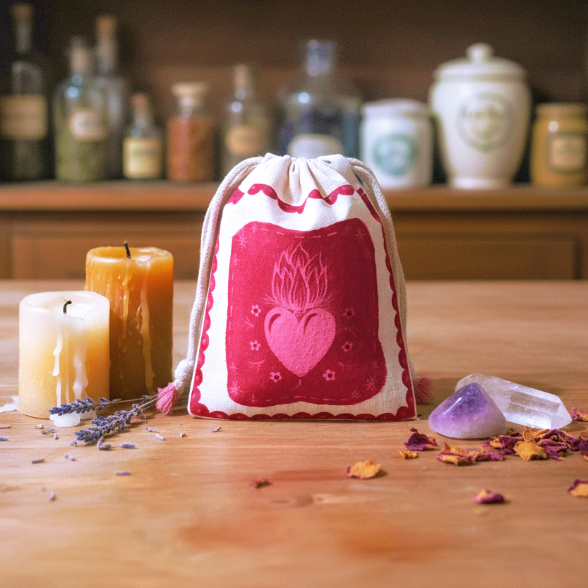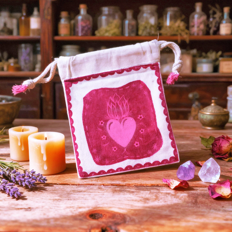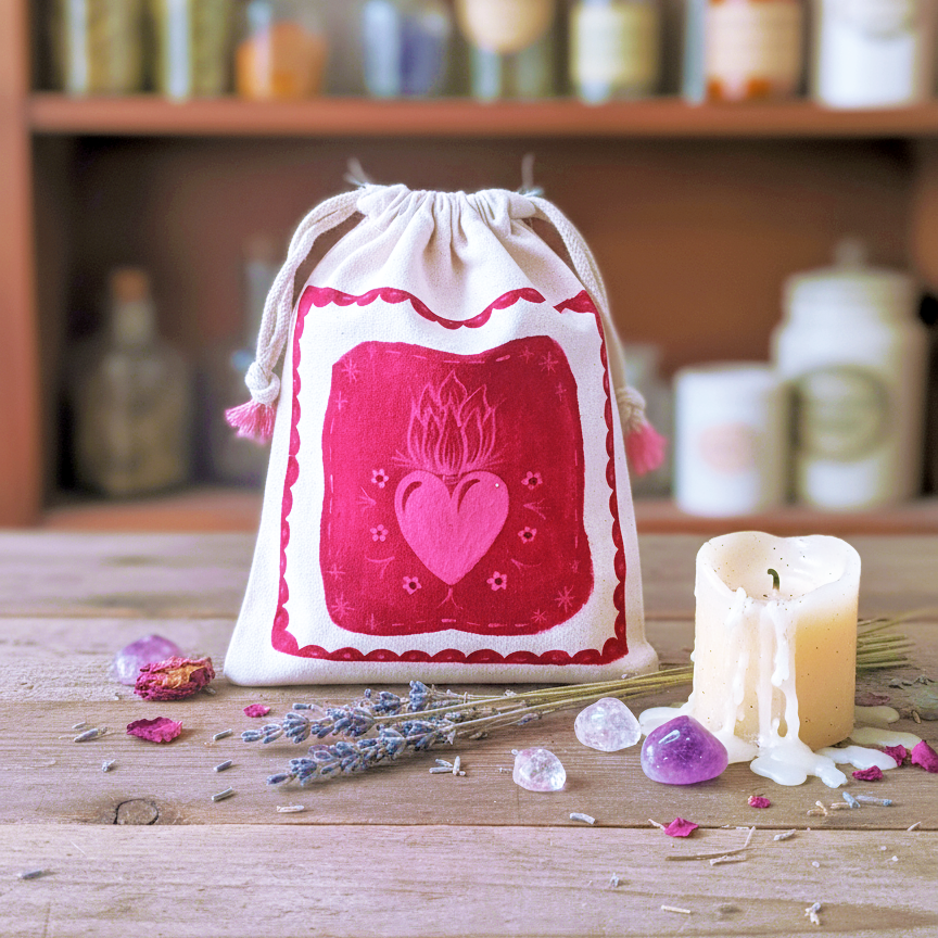Saquito artesanal que guarda la pasión y la intuición. Simboliza el fuego interior que guía y enciende la energía del amor propio y la fuerza emocional.